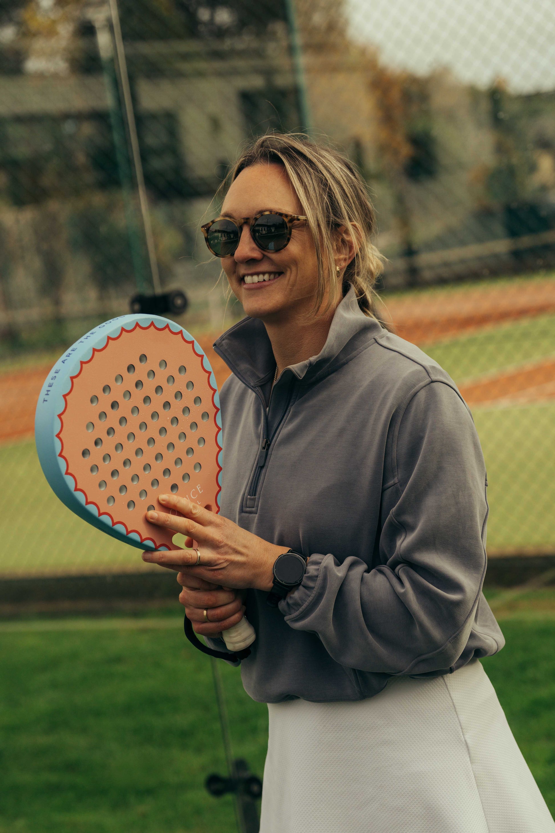 At 350g, this lightweight women’s padel racket combines a 100% carbon frame, 3K carbon surface, and teardrop shape to deliver the perfect blend of control and comfort.